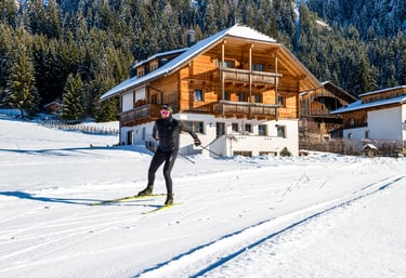La pista da fondo inizia direttamente davanti alla porta di casa. Dal caldo del letto basta un passo per uscire nella neve e immergersi in un’autentica esperienza invernale.